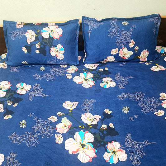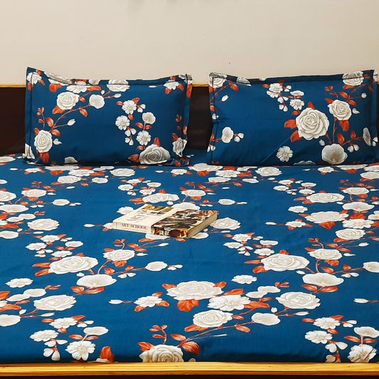 Avioni Home's Creta Premium Heavy Glaze cotton Elastic Fitted King Size Bedsheet with 2 Pillow Covers | Beautiful Blue Floral Design