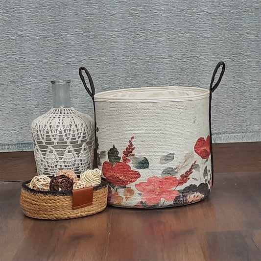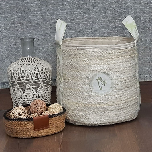 Avioni Home Hand Braided White Jute Basket | Designer Leatherette Handles | Canvas Inner for Extra Strength | Size: 28 x30 cms (~11×12 inch)
