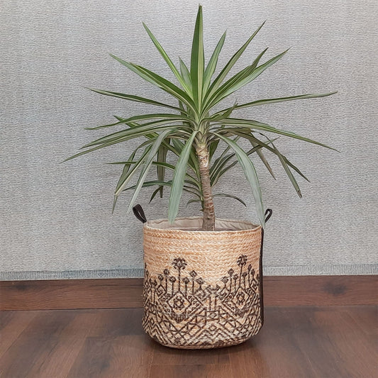 Avioni Home Hand Braided Ethnic Pattern Jute Basket | Leatherette Handles | Canvas Inner for Extra Strength | Size: 28 x30 cms (~11×12 inch)