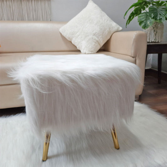 Noviato Collection – White Premium Long Faux Fur Footstool Gold Metal Legs Modern On-Trend Style Square Multi-Functional Ottoman Stool Seat, 40 cm Tall | from Avioni
