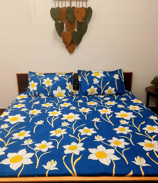 Avioni Collection's premium 100% Cotton Elastic Fitted King Size Bedsheet with 2 Pillow Covers | Blue and Yellow Floral